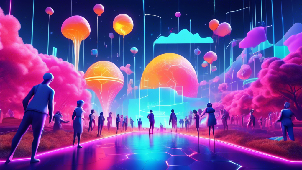 An artist's rendering of a vibrant digital marketplace showcasing diverse and unique SEI Network NFTs, highlighting a futuristic environment with traders,